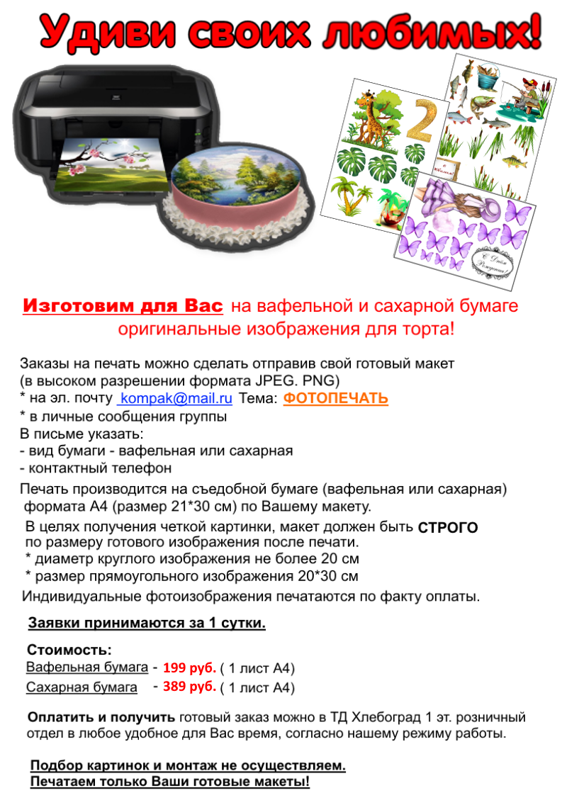 Заказы на съедобную печать принимаются и печатаются в будние дни с понедельника по пятницу.